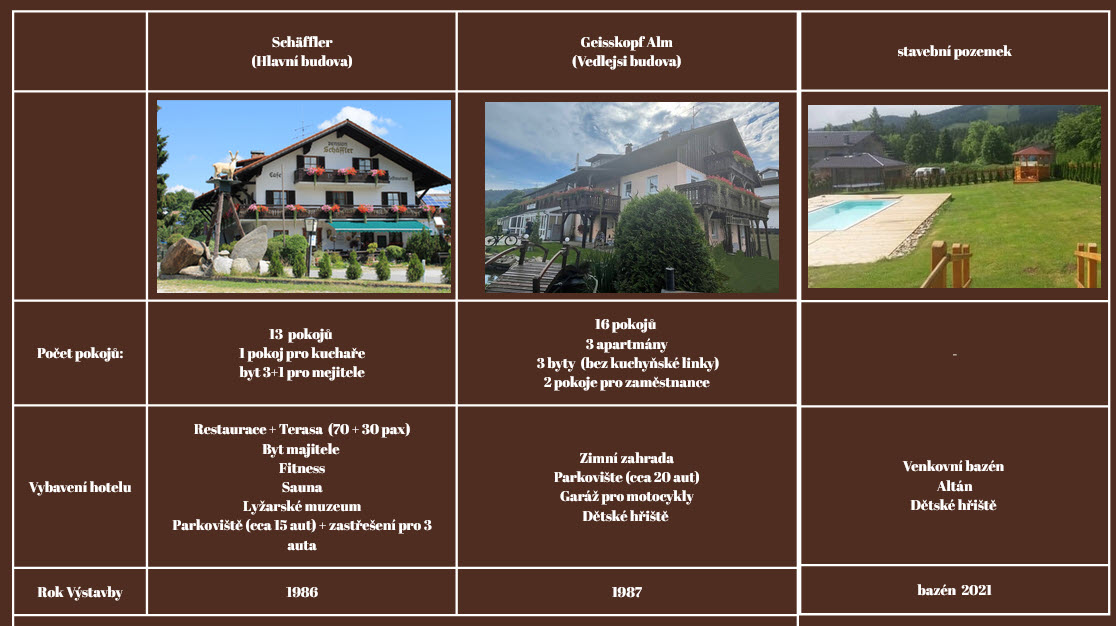 ✔️ Dvě budovy (hotely) – s celkovou kapacitou 40 ubytovacích jednotek (dvoulůžkové a třílůžkové pokoje, apartmány, byty atd.) – každá s vlastním pozemkem a výhledem na horu Geißkopf.